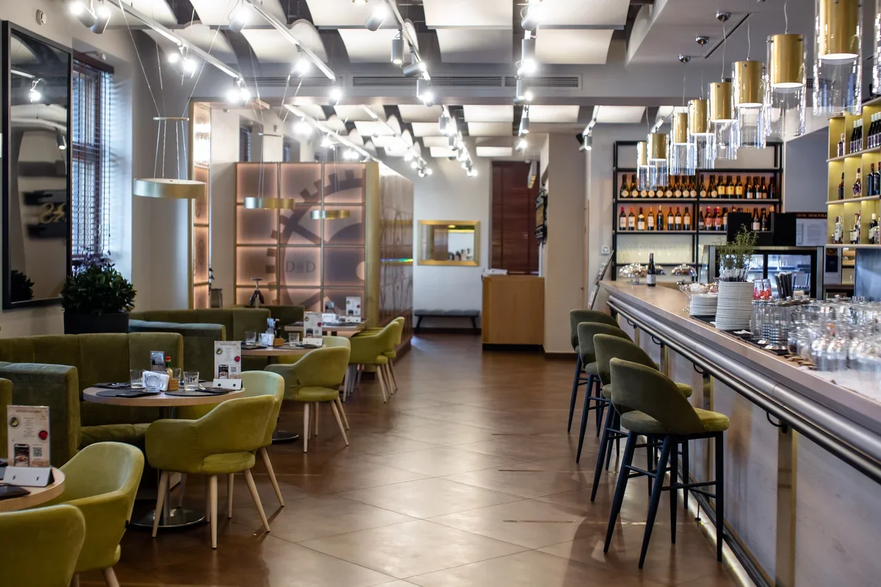 В интерьерах Drinks@Dinners удачно соединяются современный комфорт и элементы, передающие стиль индустриальной революции XIX века. Натуральный мрамор, массив дерева в отделке и мебели, мягкий велюр диванов и кресел — красота и утонченность раскрываются во всем: материалах, оттенках, деталях. Гость оказывается вовлеченным в особенную атмосферу Drinks@Dinners уже со входа.