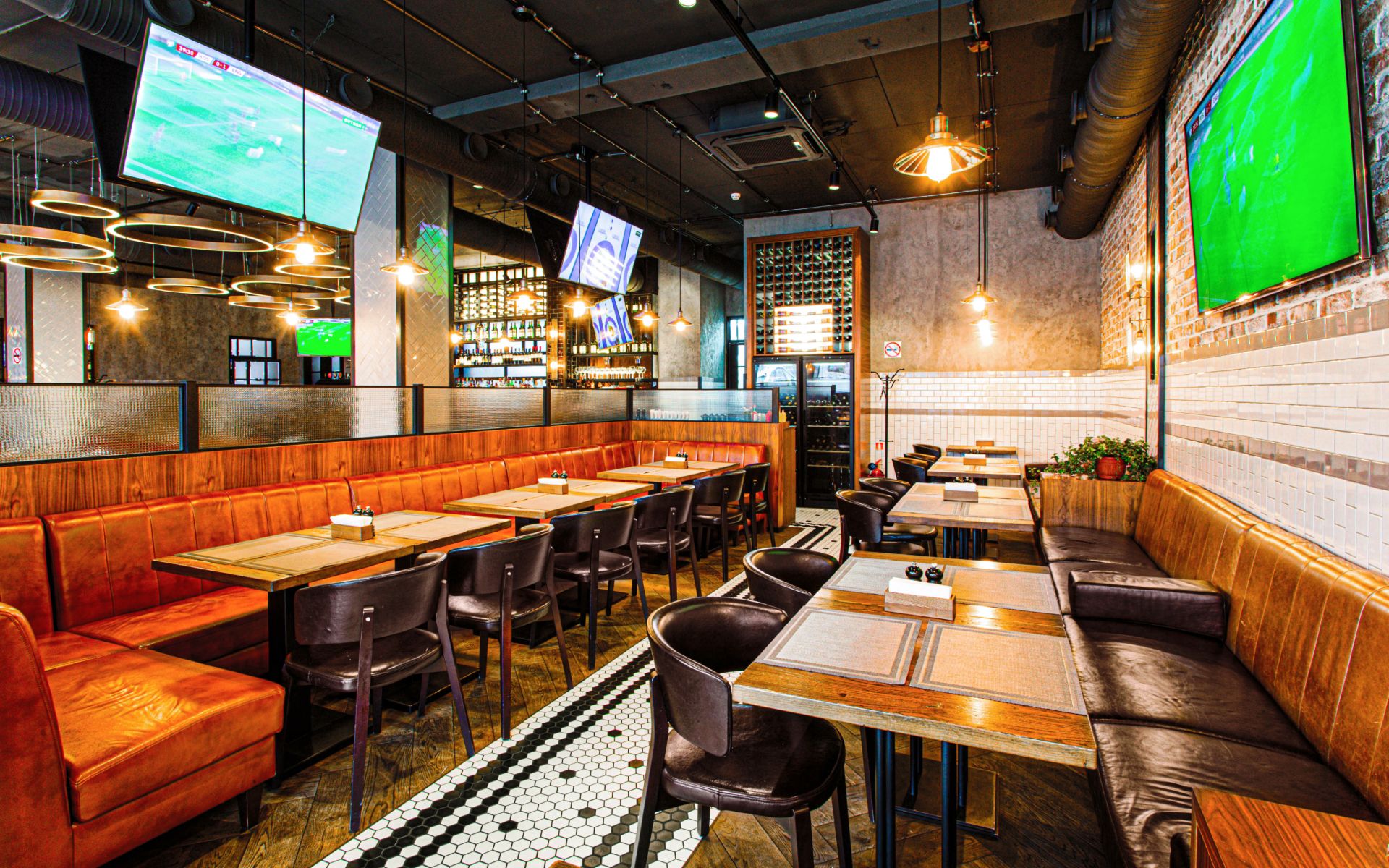 Во главе интерьера - барная стойка, выполненная из дерева и кожи в ореховых тонах, в дополнении с уютными стульями. Зал ресторана визуально разделен на зоны с большими столами и кожаными диванами для шумных компании в сочетании с небольшими столиками для уединения пар. Это позволяет комфортно разместить гостей в независимости от повода. Кроме того, по периметру расположены экраны для просмотра спортивных событий. Большие панорамные окна наполняют ресторан светом в любую погоду.