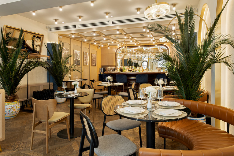 кожаный диван и стулья в глубоком синем цвете, который напоминает волны Средиземного моря. Центральный элемент — круглая барная стойка, за которой можно собираться с друзьями и потягивать Bellini или выпить по шоту эспрессо и отправиться по делам. Пальмы и