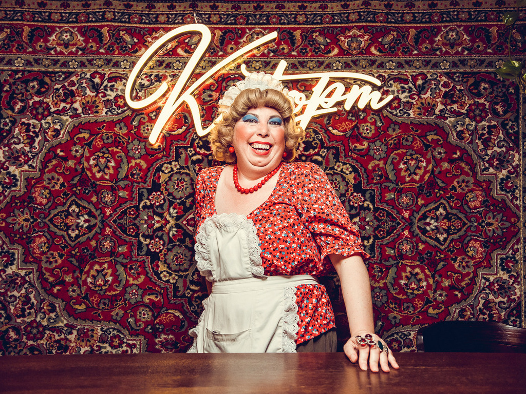 Интерьер залов – часть концепции. На стенах — плакаты с лозунгами о труде и здоровье, рисованные панно, флаги, старые фотографии. Интерьер создают деревянные буфетные витрины, хрустальные графины, магнитолы 80-х - 90-х годов, старые немецкие швейные машины. Барная стойка отделана бессчетным множеством советских книг – словно воспоминание о домашней библиотеке в зажиточной семье. Тут же рядом – настольные торговые весы и молочный бидон. Мебель тоже соответствует эпохе – взрослые гости вспомнят деревянные стулья с закругленными спинками, которые можно было увидеть практически на каждой советской кухне.